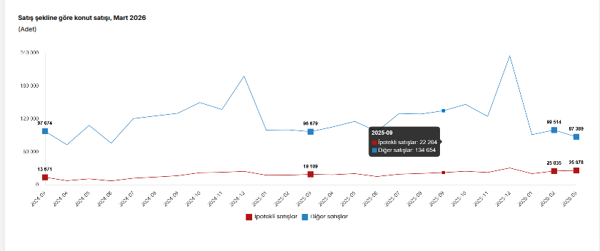 İpotekli konut satışları Mart ayında yüzde 35,9 artışla 25 bin 978 olurken, diğer konut satışları yüzde 9,6 azalarak 87 bin 389 olarak gerçekleşti.