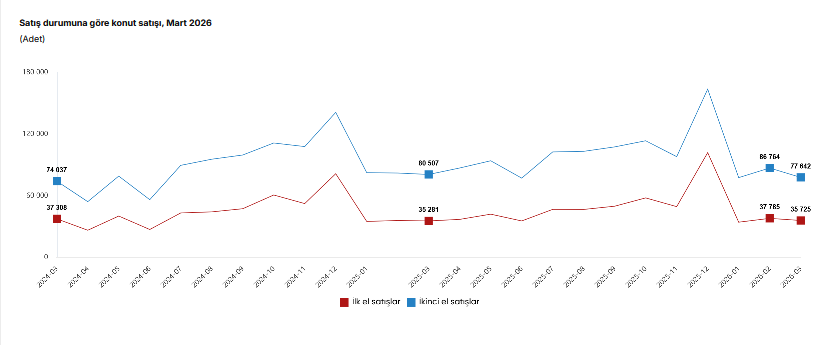 İlk el konut satışları Mart ayında yıllık yüzde 1,3 artarak 35 bin 725 olurken, ikinci el konut satışları yüzde 3,6 azalarak 77 bin 642 olarak kaydedildi. Toplam satışlar içinde ilk el konutların payı yüzde 31,5, ikinci el konutların payı yüzde 68,5 oldu.