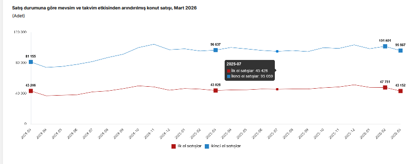 Takvim etkilerinden arındırılmış verilere göre ilk el konut satışları Mart ayında yıllık yüzde 1,8 azalırken, ikinci el konut satışları yüzde 6,2 azaldı. Mevsim ve takvim etkilerinden arındırılmış verilere göre ise bir önceki aya kıyasla ilk el satışlar yüzde 9,6, ikinci el satışlar yüzde 5,5 azalış gösterdi.