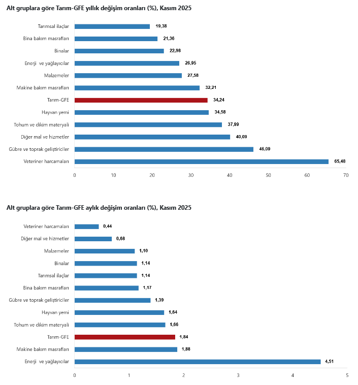 Türkiye İstatistik Kurumu’nun (TÜİK) verilerine göre, Tarım-GFE'de, Kasım'da aylık bazda yüzde 1,84, bir önceki yılın Aralık ayına göre yüzde 31,43, yıllık bazda yüzde 34,24 ve on iki aylık ortalamalara göre yüzde 32,44 arttı.